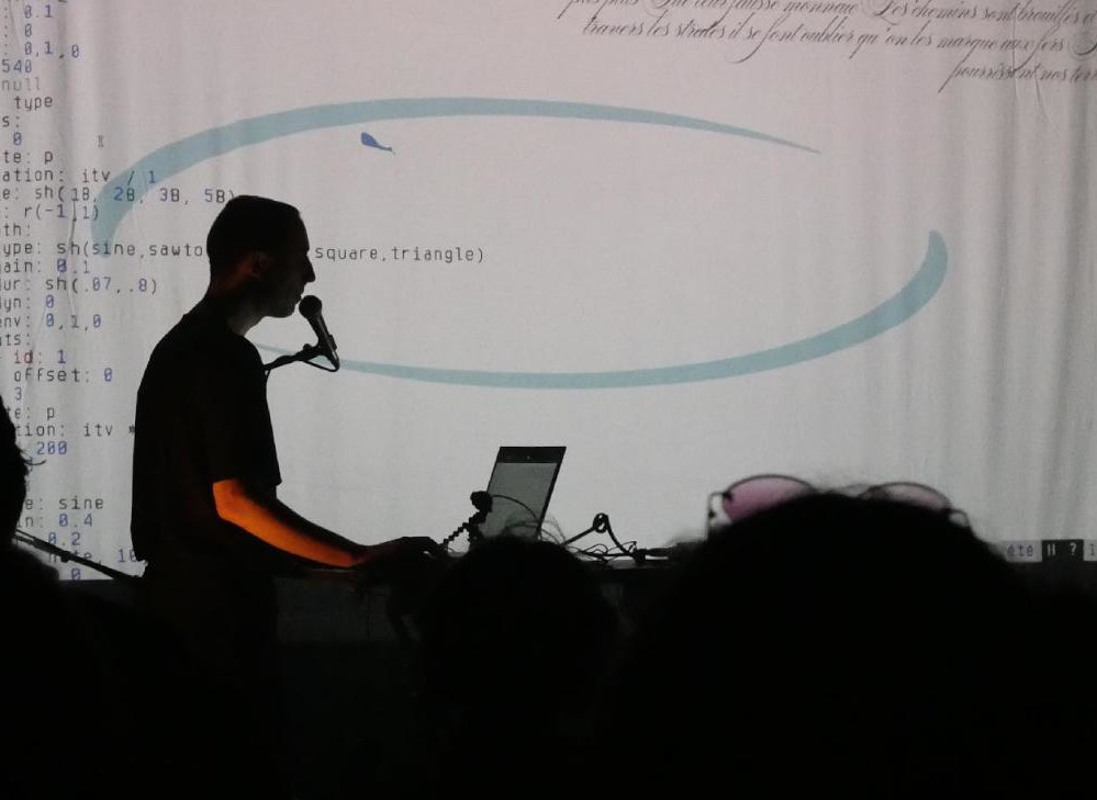 I perform live coding either through an algo folk set, involving singing, or through longer ambient sets, that I improvise depending on the mood, the public, and the venue.